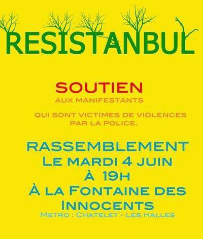 Un rassemblement de soutien aux "Campeurs de Gezi Park", place Taksim (Istanbul), est annoncé ce mardi 4 juin à 19 heures, Fontaine des Innocents (métro Châtelet-Les Halles), à l'appel notamment de l'ACORT (Assemblée citoyenne des originaires de Turquie) et d'associations du FALDI (Forum des associations de luttes démocratiques de l'immigration).