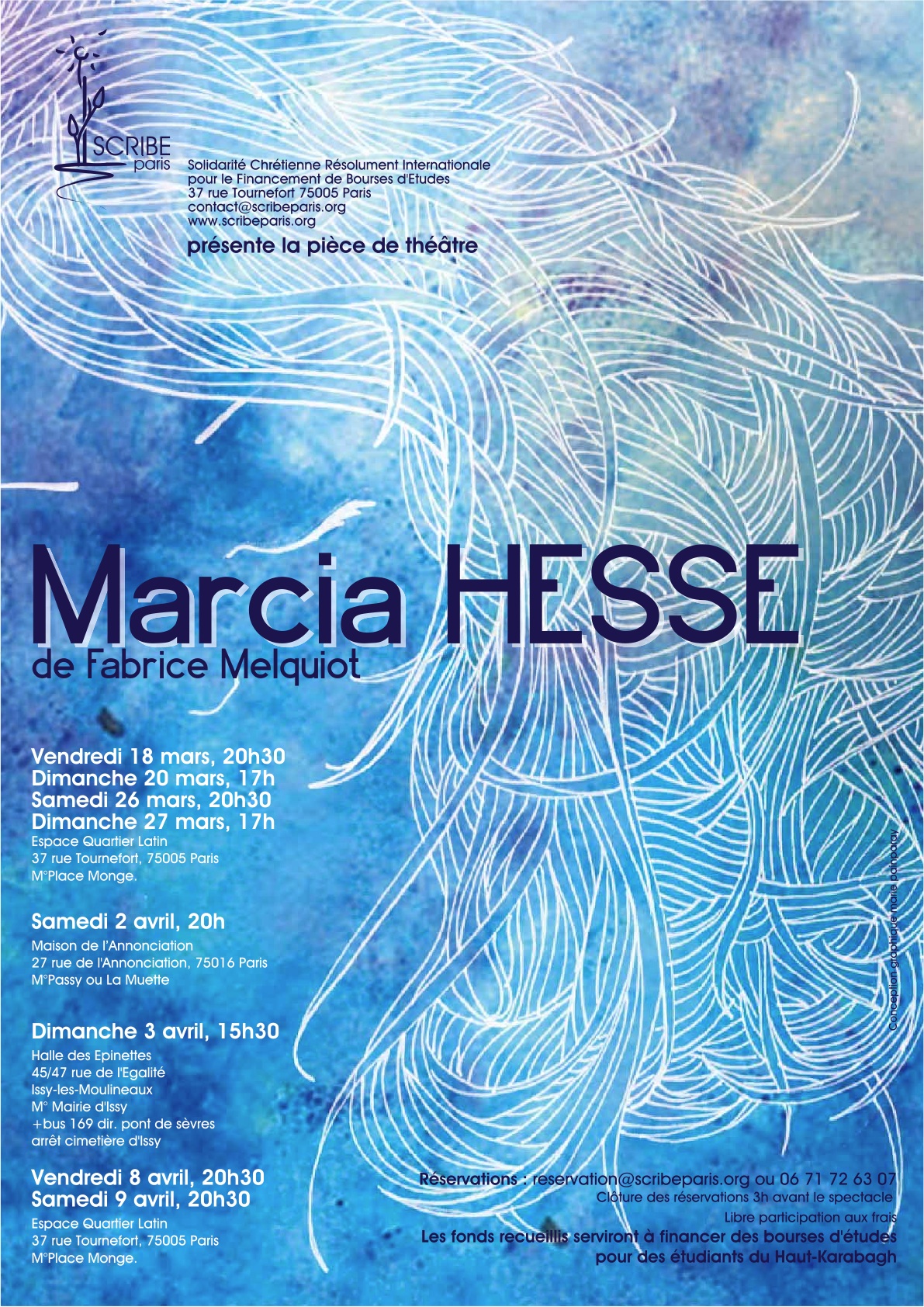 Du 18 mars au 9 avril, l’association SCRIBE-Paris propose neuf représentations de Marcia Hesse (création de Fabrice Melquiot, auteur associé au Théâtre de la Ville en 2010/2011, et nouveau directeur de Am Stram Gram à Genève), dont le produit des entrées servira à financer des bourses d’étude pour des étudiants du Haut-Karabagh.