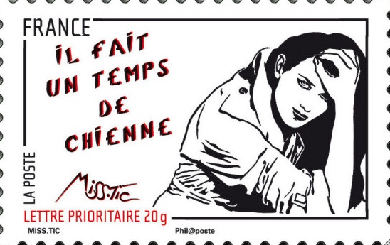 A l’occasion de la Journée de la Femme, La Poste mettra en vente en France un carnet de douze timbres autocollants à validité permanente illustrés par Miss.Tic, qui fêtait ses cinquante-cinq ans cette semaine, dont trente de street-art.
