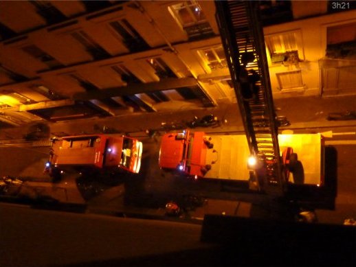 A propos de la légende de la 3ème photo, je précise que la grande échelle de la rue Victor Letalle a servi uniquement a évacuer les gens réfugiés sur les toits. L'essentiel des moyens, y compris une autre grande échelle, étaient bien sûr localisés côté Cité du labyrinthe (cf photos de presse).