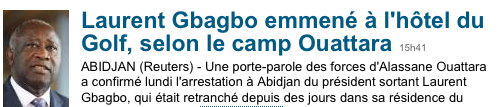Moins d’une heure plus tard, une source diplomatique française à Paris indiquait à l’AFP: «M. Gbagbo a été arrêté par les troupes de M. Ouattara, c'est vrai, mais pas par les forces spéciales françaises, qui ne sont pas rentrées dans l'enceinte de la résidence», et confirmait que le président déchu se trouvait «entre les mains des troupes fidèles à M. Ouattara». Un porte-parole du président Alassane Ouattara, a pour sa part indiqué à Reuters depuis Abidjan que M. Gbagbo et son épouse se trouvaient à l'hôtel du Golf, le quartier général de M. Ouattara. Un résumé des événements se trouve sur le site du Télégramme de Brest.