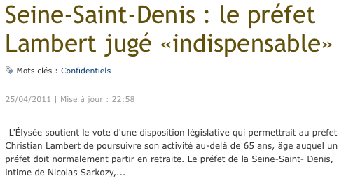 Christian Lambert, le préfet de Seine-Saint-Denis arrivé en avril 2010, aura 65 ans le 5 juin prochain. Lui et le président Sarkozy se sont rencontrés voici dix-huit ans, en mai 1993, à l’occasion de la prise d’otages de Neuilly.