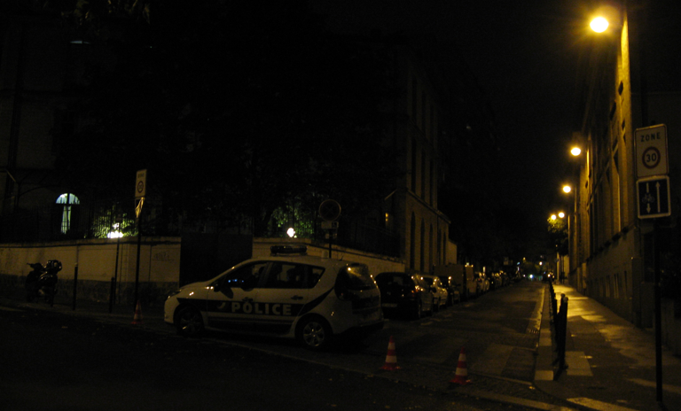 Depuis deux jours, la police française fait montre de beaucoup de présence sur les lieux. La nuit dernière, outre un camion de police juste devant le 36 rue Botzaris, une voiture sérigraphiée bloquait l’entrée de la rue du Plateau, afin que personne ne puisse approcher du n°42 (photo).