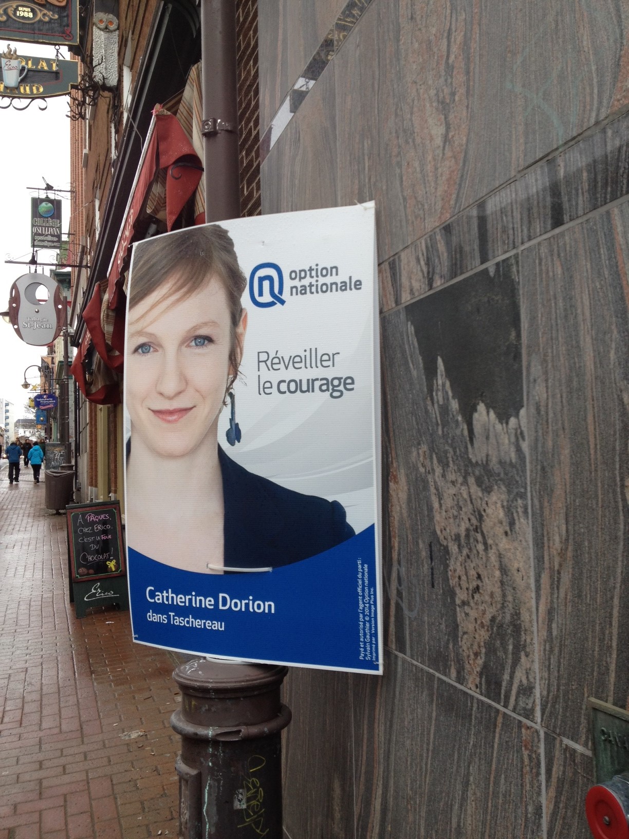Pas représenté à l'Assemblée, Option nationale est de ces partis ignorés des médias audiovisuels nationaux. Affiche de la candidate de Taschereau (dans le faubourg Saint-Jean à Québec), où la députée sortante est Agnès Maltais, ministre PQ en charge du Travail, de l'Emploi, et de la Solidarité, seule élue PQ de Québec dans l'Assemblée sortante.
